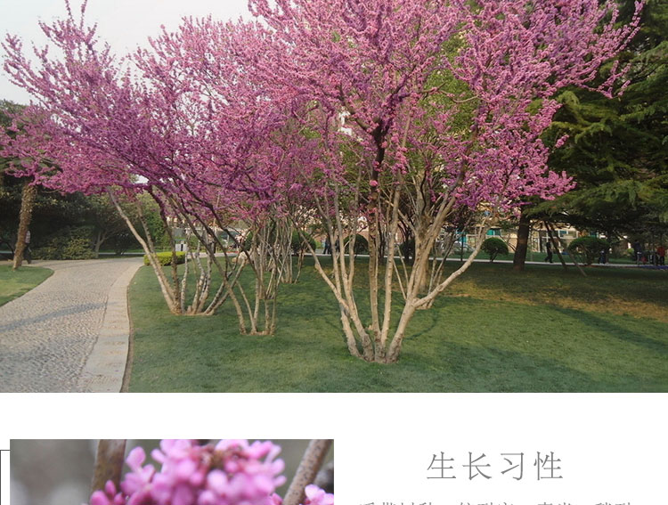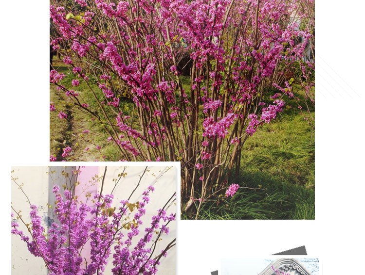 叢生紫荊先花后葉,花形如蝶,滿樹皆紅,艷麗可愛,葉片心形,多叢植于草坪邊緣和建筑物旁,園路角隅或樹林邊緣。因開花時,葉尚未發出,故宜與常綠之松柏配植為前景或植于淺色的物體前面,如白粉墻之前或巖石旁。