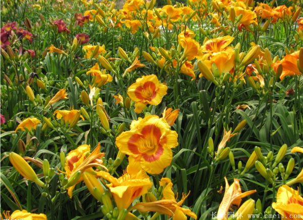 萱草,樹體高0.5~2米高左右,樹葉形狀根據種類不相同有差異,有一些很細很長,有一些比較圓,萱草花蕾顏色是增加,如國旗紅,粉紅色,鵝黃黃,粉白色等,開花的時間比較長,花量十分大,每年的是開花的季節時間段從6月上旬到8月,花種9~10月才熟,有較好的出苗水平。